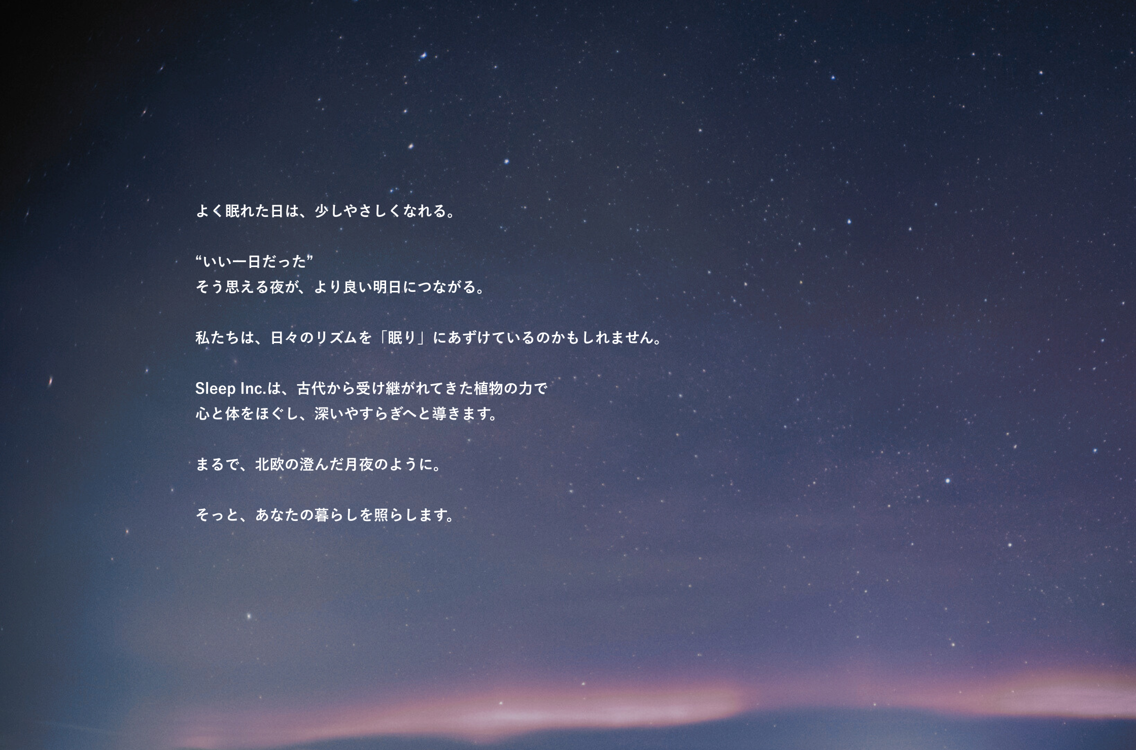 私たちはいま、本来、人間に備わっている生活リズムを見失いつつあります。Sleep Inc.は、自然界の叡智と最先端の科学技術の融合によって、「心地よい夜を過ごせない」という現代の課題に真正面から取り組んでいます。今日から、あなたが自然の力に包まれ、本来あるべき深く心地よい時間を取り戻せることを祈って。